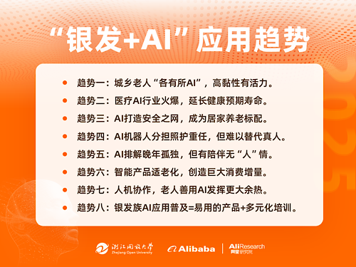 重陽節(jié)前夕,阿里巴巴聯(lián)合浙江開放大學發(fā)布《2025“銀發(fā)+AI”應(yīng)用趨勢報告》。報告分析了我國老年群體應(yīng)用AI的現(xiàn)狀與趨勢,基于調(diào)研和數(shù)據(jù)提出:老年群體是AI時代充滿潛能的深度參與者,將在居家養(yǎng)老、健康醫(yī)療、護理看管、情感陪伴、職業(yè)延續(xù)等場景全面收獲AI紅利。與此同時,“AI+銀發(fā)”正在創(chuàng)造顯著的消費增量,過去一年,淘寶天貓平臺的適老化智能產(chǎn)品普遍實現(xiàn)銷售額的三位數(shù)增長。