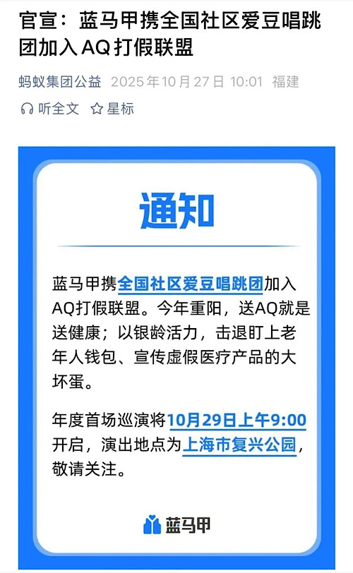 29日一大早,上海市復(fù)興公園就熱鬧了起來(lái):一場(chǎng)堪稱(chēng)“小區(qū)盛事”的“藍(lán)馬甲樂(lè)齡健康嘉年華”吸引了不少老年人準(zhǔn)時(shí)到場(chǎng),為“社區(qū)愛(ài)豆”們現(xiàn)場(chǎng)打call。兩天前,也就是10月27日,“藍(lán)馬甲行動(dòng)”正式宣布攜手全國(guó)社區(qū)愛(ài)豆唱跳團(tuán)加入AQ打假聯(lián)盟,為期兩天的首輪巡演也就此拉開(kāi)序幕。