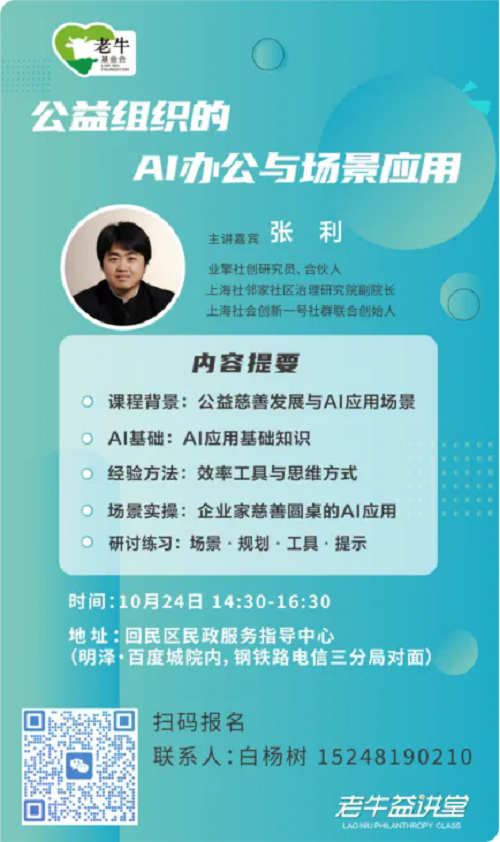 10月20日,老?;饡?huì)微信發(fā)布消息,第32期老牛益講堂將于10月24日下午在呼和浩特市回民區(qū)民政指導(dǎo)中心(一樓會(huì)議室)舉辦,主題聚焦“公益組織的AI辦公與場(chǎng)景應(yīng)用——效率工具·思維方式·現(xiàn)實(shí)場(chǎng)景”。本次活動(dòng)由內(nèi)蒙古老牛慈善基金會(huì)發(fā)起,多家公益機(jī)構(gòu)聯(lián)合主辦。特邀業(yè)擎社創(chuàng)研究員、合伙人,上海社鄰家社區(qū)治理研究院副院長(zhǎng),上海社會(huì)創(chuàng)新一號(hào)社群聯(lián)合創(chuàng)始人張利主講。