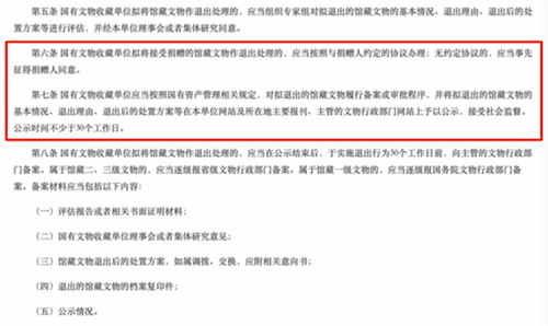 第七條規(guī)定,國有文物收藏單位對擬退出的館藏文物履行備案或?qū)徟绦颍瑧?yīng)將館藏文物的基本情況、退出理由、退出后的處置方案等進(jìn)行不少于30個(gè)工作日的公示期,接受社會監(jiān)督。
