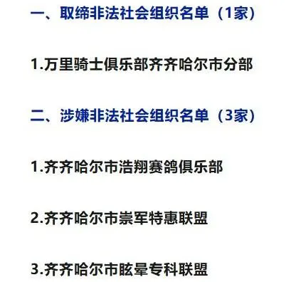 黑龍江省齊齊哈爾市民政局日前發(fā)布關(guān)于集中公布2025年第三批取締、涉嫌非法社會(huì)組織名單的通告。其中取締一家——萬里騎士俱樂部齊齊哈爾市分部;涉嫌非法社會(huì)組織三家——齊齊哈爾市浩翔賽鴿俱樂部、齊齊哈爾市崇軍特惠聯(lián)盟、齊齊哈爾市眩暈??坡?lián)盟。