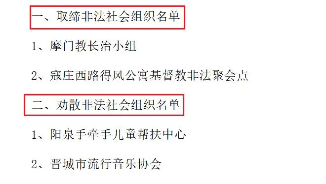 據(jù)山西省民政廳10月14日消息,山西省民政廳日前公布了一批依法取締和勸散的非法社會(huì)組織名單,其中取締兩家,包括摩門教長治小組、寇莊西路得風(fēng)公寓基督教非法聚會(huì)點(diǎn);勸散兩家,包括陽泉手牽手兒童幫扶中心、晉城市流行音樂協(xié)會(huì)。