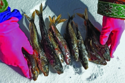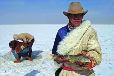 巡護隊員萬瑪才讓小心地托著一條從網(wǎng)上摘下的足有30公分長的湟魚。幸運的是,這條湟魚還活著。他說,這條魚有幾十歲大了,非常珍貴。當它被小心翼翼地放回冰洞,一扭身,瞬間在大家視線中消失時,所有人鼓起掌來。 |