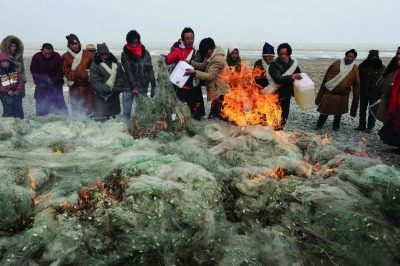 2015年2月4日,剛察縣,南加和當?shù)氐难沧o隊員把近期收繳的魚網(wǎng),集中起來銷毀。 |