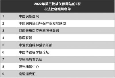 近日,民政部、中央網(wǎng)信辦、工業(yè)和信息化部持續(xù)深入落實(shí)中央關(guān)于打擊整治非法社會(huì)組織決策部署,精準(zhǔn)發(fā)力,有效打擊,依法關(guān)停了2022年第三批9家非法社會(huì)組織網(wǎng)站及相關(guān)新媒體賬號(hào),清除了有關(guān)關(guān)聯(lián)網(wǎng)頁(yè)。 自2021年3月20日進(jìn)一步打擊整治非法社會(huì)組織專項(xiàng)行動(dòng)開(kāi)展以來(lái),,依據(jù)《中華人民共和國(guó)網(wǎng)絡(luò)安全法》《互聯(lián)網(wǎng)信息服務(wù)管理辦法》等有關(guān)法律法規(guī),對(duì)已取締的非法社會(huì)組織網(wǎng)站進(jìn)行排查,至今已分十批次關(guān)停了110家處于存續(xù)狀態(tài)的非法社會(huì)組織網(wǎng)站及微信、微博等新媒體賬號(hào),進(jìn)一步夯實(shí)了線下打擊整治成果,鞏固了線上線下治理閉環(huán)。 此次關(guān)停操作涉及中國(guó)民族畫院、中國(guó)潤(rùn)興綠地環(huán)保產(chǎn)業(yè)發(fā)展聯(lián)盟、中愛(ài)聯(lián)合純種貓俱樂(lè)部、河南健康醫(yī)療志愿服務(wù)聯(lián)盟等9家已被取締的非法社會(huì)組織。 民政部將持續(xù)保持打擊整治高壓態(tài)勢(shì),加強(qiáng)網(wǎng)絡(luò)監(jiān)測(cè)與排查,線上線下同步查處,堅(jiān)決鏟除非法社會(huì)組織的滋生土壤。對(duì)于性質(zhì)惡劣、屢教不改的非法社會(huì)組織發(fā)起人,還將提請(qǐng)工信部門依法納入違法互聯(lián)網(wǎng)站(主辦者)黑名單。歡迎社會(huì)各界登錄中國(guó)社會(huì)組織政務(wù)服務(wù)平臺(tái),通過(guò)“投訴舉報(bào)”欄目,提供涉嫌非法社會(huì)組織活動(dòng)信息、主要負(fù)責(zé)人及骨干人員的線索信息。 再次提醒有關(guān)機(jī)構(gòu)和社會(huì)公眾,在與社會(huì)組織開(kāi)展合作或者參與其活動(dòng)時(shí),務(wù)必注意核查其身份。全國(guó)社會(huì)組織的登記信息可通過(guò)中國(guó)社會(huì)組織政務(wù)服務(wù)平臺(tái)、中國(guó)社會(huì)組織動(dòng)態(tài)政務(wù)微信(微信號(hào):chinanpogov)等渠道在線查詢。 (據(jù)民政部官網(wǎng))  |