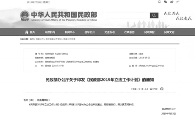 7月16日,民政部對(duì)外公布了《民政部2019年立法工作計(jì)劃》。被列入計(jì)劃的有2件法律,6件行政法規(guī),3件部門規(guī)章。
