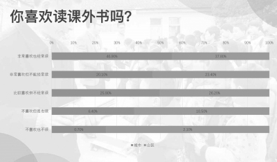 數(shù)據(jù)顯示,有3.5%的山區(qū)學生從來不看課外書;閱讀課外書在三本以下的山區(qū)學生比城市學生多10%左右;閱讀課外書五本以上的城市學生比山區(qū)學生多12%左右;非常喜歡也經(jīng)常讀課外書的城市學生比山區(qū)學生多近10%;非常喜歡,但不經(jīng)常讀課外書的山區(qū)學生和城市學生比例都高于20%。