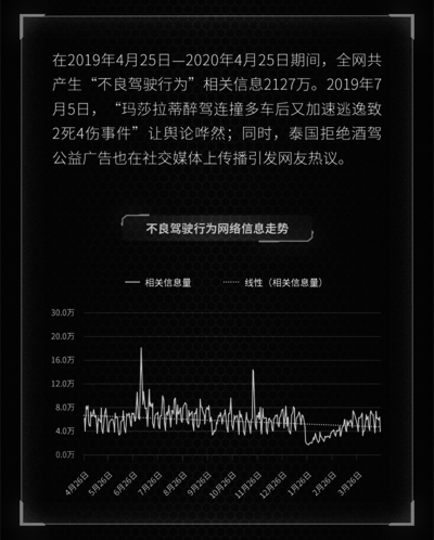 國家統(tǒng)計局數(shù)據(jù)顯示,2012至2018年間,全國共發(fā)生交通事故144.8萬起,有42.5萬人因交通事故而喪生。2019年4月25日至2020年4月25日,全網(wǎng)共產(chǎn)生“道路交通安全”相關(guān)信息4166萬條,其中“不良駕駛行為”相關(guān)信息達2127萬條,占比超50%。