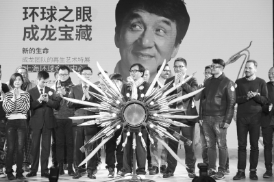 2017年3月16日下午,“環(huán)球之眼 成龍寶藏”——成龍團(tuán)隊(duì)的再生藝術(shù)特展開(kāi)幕式在上海環(huán)球金融中心94樓盛大舉行,國(guó)際巨星成龍及其團(tuán)隊(duì)、參展藝術(shù)家代表等盛裝出席。在現(xiàn)場(chǎng),無(wú)論是背景板上醒目的“再設(shè)計(jì),再使用”標(biāo)記,還是舞蹈演員身上用膠片制成的華服,抑或是由電影拍攝器材組裝而成的啟動(dòng)裝置,無(wú)不透露出此次展覽“快樂(lè)環(huán)保”的主題。