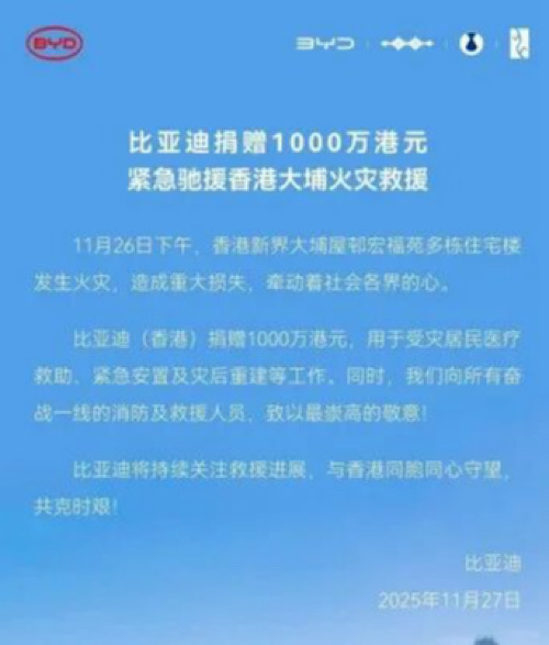 比亞迪(香港)宣布捐贈1000萬港元,用于受災居民醫(yī)療救助、緊急安置及災后重建等工作。比亞迪方面表示,將持續(xù)關注救援進展,與香港同胞同心守望,共克時艱。