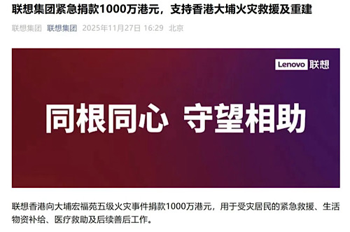 據(jù)聯(lián)想集團微信公眾號消息,聯(lián)想香港向大埔宏福苑五級火災事件捐款1000萬港元,用于受災居民的緊急救援、生活物資補給、醫(yī)療救助及后續(xù)善后工作。聯(lián)想香港已動員集團義工積極參與支持工作,并將與相關部門緊密跟進,探討以科技方案協(xié)助救援及重建工作,與香港市民同心同行,全力救災。