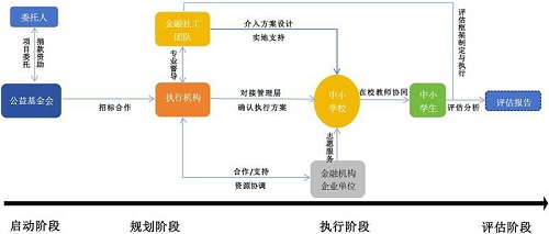 在此基礎上,項目形成可復制的協作框架,各主體把中小學校園確立為項目的軸心,所有協作都圍繞學校教學框架組織起來。在前期,基金會負責經費統籌與跨區(qū)對接,執(zhí)行機構與校園端完成授課時間、課程需求與教學名單的對齊,高校金融社會工作團隊則面向合作學校開展需求調研,并基于調研內容針對性設計課程與活動;在實施期,各主體以校園為節(jié)點,執(zhí)行機構調度志愿者講師與物料,確保每節(jié)課都能在校內完成知識學習、情境實踐、課程復盤的完整鏈條,金融社工團隊則在過程中提供專業(yè)督導,支持活動順利開展,而金融機構志愿者講師則把行業(yè)經驗轉化為課堂中生動的案例分析與情境演練;在評估期,學校組織學生參加測評,執(zhí)行機構與金融社工團隊匯總與復盤,而金融社工團隊則設計與執(zhí)行專業(yè)評估。通過把校園置于協作體系的中心,形成多元主體的協同合力,沉淀出可在不同地區(qū)、學??焖購椭啤㈦S校歷靈活調度的校本金融教育協作模式。