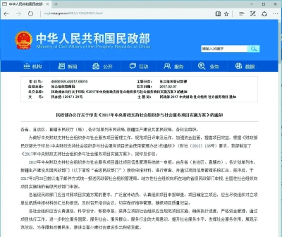 2017年2月7日,民政部辦公廳印發(fā)《2017年中央財(cái)政支持社會(huì)組織參與社會(huì)服務(wù)項(xiàng)目實(shí)施方案》(簡(jiǎn)稱《方案》)。這是自2012年起,中央財(cái)政連續(xù)第六年通過民政部部門預(yù)算安排專項(xiàng)資金,用于支持社會(huì)組織參與社會(huì)服務(wù)。