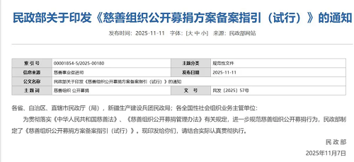 為進一步規(guī)范慈善組織公開募捐方案備案工作,提高公開募捐方案備案表填報質(zhì)量,11月11日,民政部官網(wǎng)發(fā)布《慈善組織公開募捐方案備案指引(試行)》(以下簡稱《指引》),自2026年1月1日起施行。