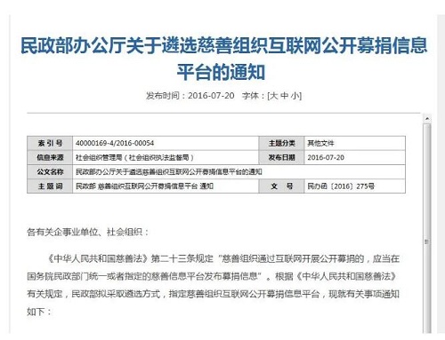 最終產(chǎn)生了首批互聯(lián)網(wǎng)公開(kāi)募捐信息平臺(tái)。