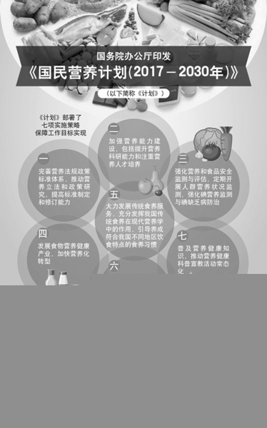 7月13日,國(guó)務(wù)院辦公廳發(fā)布了《國(guó)民營(yíng)養(yǎng)計(jì)劃(2017—2030年)》。計(jì)劃提出了國(guó)民營(yíng)養(yǎng)工作2020年和2030年分別要達(dá)到的目標(biāo)。