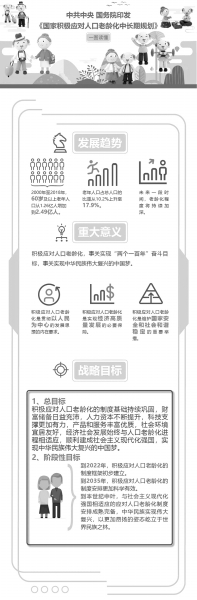 ■ 本報記者 王勇 為積極應(yīng)對人口老齡化,按照黨的十九大決策部署,近日,中共中央、國務(wù)院印發(fā)了《國家積極應(yīng)對人口老齡化中長期規(guī)劃》(以下簡稱《規(guī)劃》)。《規(guī)劃》近期至2022年,中期至2035年,遠期展望至2050年,是到本世紀(jì)中葉我國積極應(yīng)對人口老齡化的戰(zhàn)略性、綜合性、指導(dǎo)性文件。 《規(guī)劃》明確了積極應(yīng)對人口老齡化的戰(zhàn)略目標(biāo),即積極應(yīng)對人口老齡化的制度基礎(chǔ)持續(xù)鞏固,財富儲備日益充沛,人力資本不斷提升,科技支撐更加有力,產(chǎn)品和服務(wù)豐富優(yōu)質(zhì),社會環(huán)境宜居友好,經(jīng)濟社會發(fā)展始終與人口老齡化進程相適應(yīng),順利建成社會主義現(xiàn)代化強國,實現(xiàn)中華民族偉大復(fù)興的中國夢。 到2022年,我國積極應(yīng)對人口老齡化的制度框架初步建立;到2035年,積極應(yīng)對人口老齡化的制度安排更加科學(xué)有效;到本世紀(jì)中葉,與社會主義現(xiàn)代化強國相適應(yīng)的應(yīng)對人口老齡化制度安排成熟完備。 《規(guī)劃》從5個方面部署了應(yīng)對人口老齡化的具體工作任務(wù)。 我國老齡化程度將持續(xù)加深 人口老齡化是社會發(fā)展的重要趨勢,是人類文明進步的體現(xiàn),也是今后較長一段時期我國的基本國情。我國自20世紀(jì)末進入老齡化社會以來,老年人口數(shù)量和占總?cè)丝诘谋戎爻掷m(xù)增長,2000年至2018年,60歲及以上老年人口從1.26億人增加到2.49億人,老年人口占總?cè)丝诘谋戎貜?0.2%上升至17.9%。未來一段時間,老齡化程度將持續(xù)加深。 國家發(fā)展改革委負責(zé)人就《國家積極應(yīng)對人口老齡化中長期規(guī)劃》答記者問時表示,積極應(yīng)對人口老齡化,是黨中央、國務(wù)院正確把握人口發(fā)展大趨勢和老齡化規(guī)律,作出的立足當(dāng)下、著眼長遠的重大戰(zhàn)略部署,事關(guān)實現(xiàn)“兩個一百年”奮斗目標(biāo),事關(guān)實現(xiàn)中華民族偉大復(fù)興的中國夢,對于堅持以人民為中心的發(fā)展思想、實現(xiàn)經(jīng)濟高質(zhì)量發(fā)展、維護國家安全和社會和諧穩(wěn)定,具有重大意義。 積極應(yīng)對人口老齡化是貫徹以人民為中心的發(fā)展思想的內(nèi)在要求;是實現(xiàn)經(jīng)濟高質(zhì)量發(fā)展的必要保障;是維護國家安全和社會和諧穩(wěn)定的重要舉措。 三大階段性目標(biāo) 據(jù)國家發(fā)展改革委負責(zé)人介紹,積極應(yīng)對人口老齡化的戰(zhàn)略總目標(biāo)是:積極應(yīng)對人口老齡化的制度基礎(chǔ)持續(xù)鞏固,財富儲備日益充沛,人力資本不斷提升,科技支撐更加有力,產(chǎn)品和服務(wù)豐富優(yōu)質(zhì),社會環(huán)境宜居友好,經(jīng)濟社會發(fā)展始終與人口老齡化進程相適應(yīng),順利建成社會主義現(xiàn)代化強國,實現(xiàn)中華民族偉大復(fù)興的中國夢。 階段性目標(biāo)分別是:到2022年,積極應(yīng)對人口老齡化的制度框架初步建立。全員勞動生產(chǎn)率平穩(wěn)增長,勞動年齡人口平均受教育年限穩(wěn)步提升?;攫B(yǎng)老保險和基本醫(yī)療保險基本實現(xiàn)法定人員全覆蓋,養(yǎng)老保障水平正常調(diào)整機制初步建立。多層次養(yǎng)老保險制度體系初步構(gòu)建,功能完善、規(guī)模適度、覆蓋城鄉(xiāng)、醫(yī)養(yǎng)結(jié)合的養(yǎng)老服務(wù)體系基本建成,老年宜居的社會環(huán)境初步建立。 到2035年,積極應(yīng)對人口老齡化的制度安排更加科學(xué)有效,社會財富儲備進入高收入國家行列。全員勞動生產(chǎn)率合理增長,總體實現(xiàn)教育現(xiàn)代化?;攫B(yǎng)老保險和基本醫(yī)療保險應(yīng)保盡保,實現(xiàn)法定人員全覆蓋。構(gòu)建起多層次養(yǎng)老保險制度體系。主要健康指標(biāo)進入高收入國家行列,人均預(yù)期壽命和健康預(yù)期壽命穩(wěn)步提升,老年人健康水平不斷提高,有序銜接、綜合連續(xù)的健康服務(wù)體系基本形成。中國特色養(yǎng)老服務(wù)體系成熟定型,全體老年人享有基本養(yǎng)老服務(wù)。國家創(chuàng)新能力躋身世界前列,科技對應(yīng)對人口老齡化的支撐作用顯著增強。老年友好型社會總體建成。 到本世紀(jì)中葉,與社會主義現(xiàn)代化強國相適應(yīng)的應(yīng)對人口老齡化制度安排成熟完備,老年友好城市、友好鄉(xiāng)村、友好社區(qū)遍布全國,全體人民生活更加幸福安康,中華民族實現(xiàn)偉大復(fù)興,以更加昂揚的姿態(tài)屹立于世界民族之林。 五方面具體任務(wù) 《規(guī)劃》從5個方面部署了應(yīng)對人口老齡化的具體工作任務(wù)。 第一,夯實應(yīng)對人口老齡化的社會財富儲備。通過擴大總量、優(yōu)化結(jié)構(gòu)、提高效益,實現(xiàn)經(jīng)濟發(fā)展與人口老齡化相適應(yīng)。通過完善國民收入分配體系,優(yōu)化政府、企業(yè)、居民之間的分配格局,穩(wěn)步增加養(yǎng)老財富儲備。健全更加公平更可持續(xù)的社會保障制度,持續(xù)增進全體人民的福祉水平。 第二,改善人口老齡化背景下的勞動力有效供給。通過提高出生人口素質(zhì)、提升新增勞動力質(zhì)量、構(gòu)建老有所學(xué)的終身學(xué)習(xí)體系,提高我國人力資源整體素質(zhì)。推進人力資源開發(fā)利用,實現